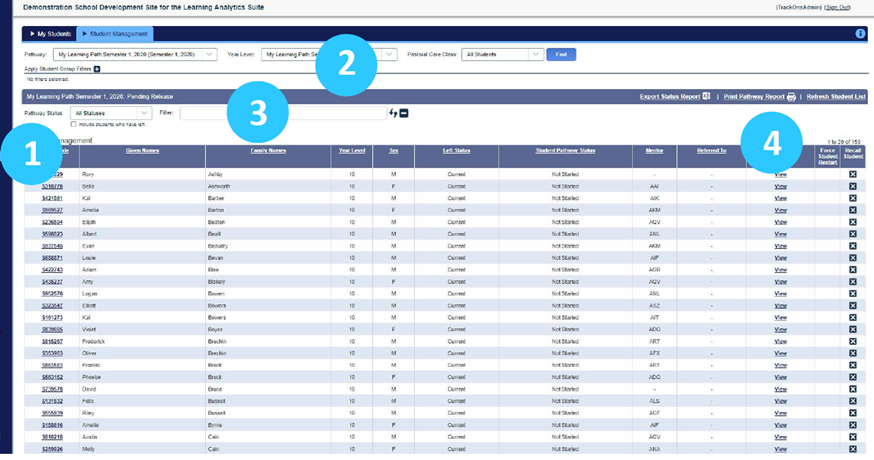 - The list of students will appear. The user is then able to: